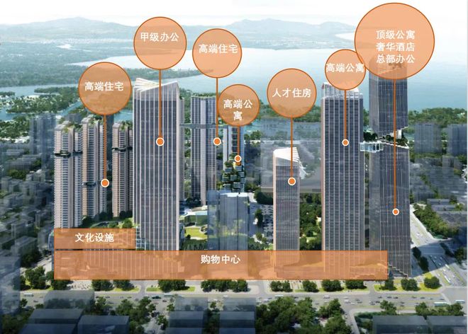 项目包含住宅、公寓、写字楼、酒店、商业、教育、公园等多种业态。目前在售的是一期的03地块由4栋住宅和2栋公寓组成,占地面积 21889.28㎡,建筑面积约16.8万㎡,容积率约8-9,车位比1:1.3;即将加推的二期是由2栋住宅+商业+办公组成。